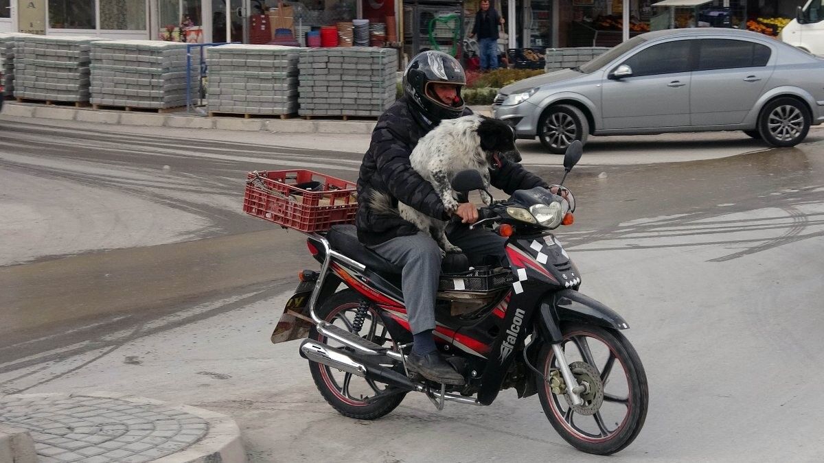 Sahibine olan düşkünlüğü kadar araçta seyahat etmeyi de seven köpek, her gün sahibi ile motosiklet üzerinde işe gidip geliyor.