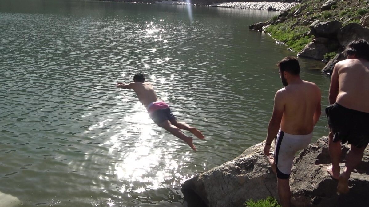 Rehber İskender Kahraman öncülüğündeki 20 kişilik grup, Cilo Dağları eteklerinde doğa yürüyüşü yaptıktan sonra 3 bin 500 rakımdaki Kervan Gölü’nde yüzerek günün keyfini çıkardı.