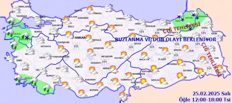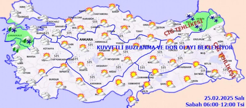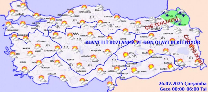 Yurdun kuzey, iç ve doğu kesimlerinde buzlanma ve don ile birlikte pus ve yer yer sis hadisesi bekleniyor. Doğu Karadeniz’in iç kesimlerinin yüksekleri ile Doğu Anadolu’nun yüksek ve dik yamaçlarında çığ tehlikesi bulunmaktadır." notu düşüldü.