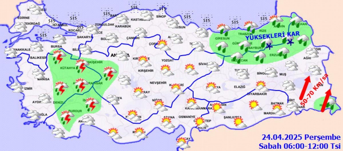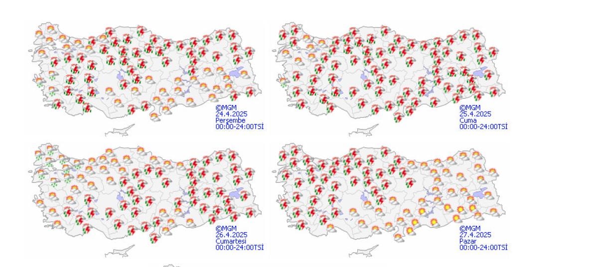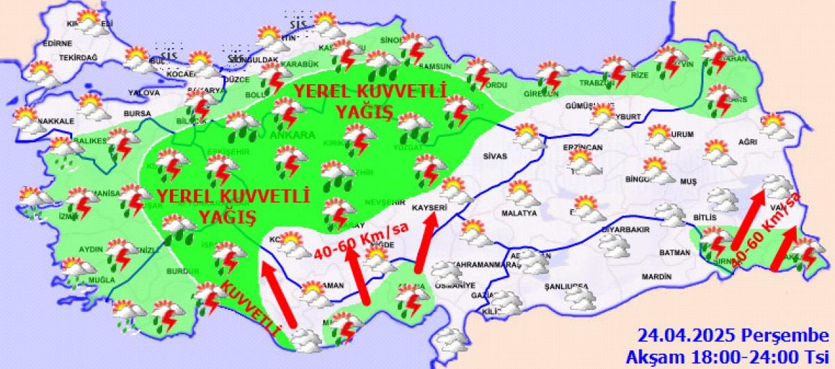 Meteoroloji'nin değerlendirmelerine göre; İç Anadolu, Batı ve Orta Karadeniz'in iç kesimleri, Doğu Karadeniz ve Doğu Anadolu'nun kuzey ve doğusunda sağanak yağış etkili olacak. Yağışların İç Ege, Batı Akdeniz ve Batı Karadeniz’in iç kesimleri, İç Anadolu’nun kuzey ve batısında yerel kuvvetli olması bekleniyor.