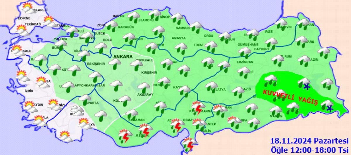 Yağışların, genellikle yağmur ve sağanak, Orta ve Doğu Akdeniz kıyılarında gök gürültülü sağanak, Doğu Karadeniz’in iç kesimlerinin yüksekleri ile Doğu Anadolu’nun kuzey ve doğusunun yüksek kesimlerinde karla karışık yağmur ve kar şeklinde olması bekleniyor.