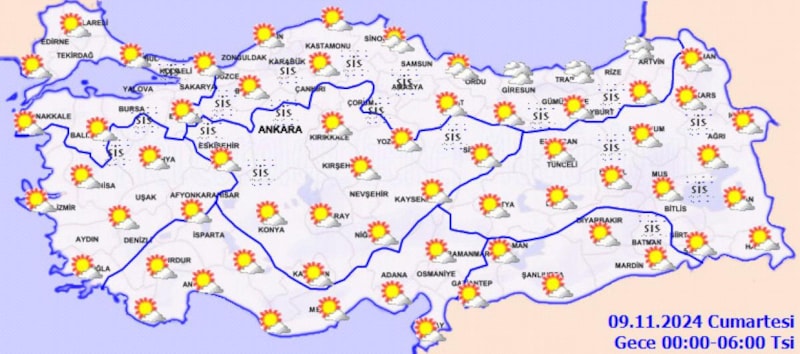 Ayrıca yayınlanan rapora, "Ülkemiz genelinde yağış beklenmiyor. Yurdun kuzey kesimlerinin parçalı bulutlu, diğer yerlerin az bulutlu ve açık geçeceği tahmin ediliyor. Sabah ve gece saatlerinde kuzey ve iç kesimlerde yer yer pus ve sis bekleniyor." notu düşüldü.