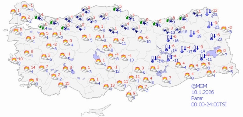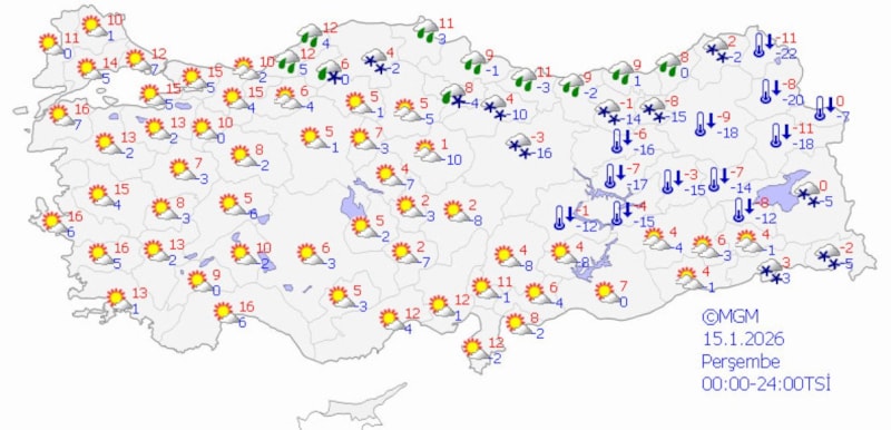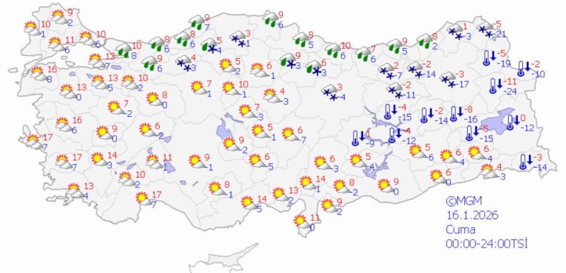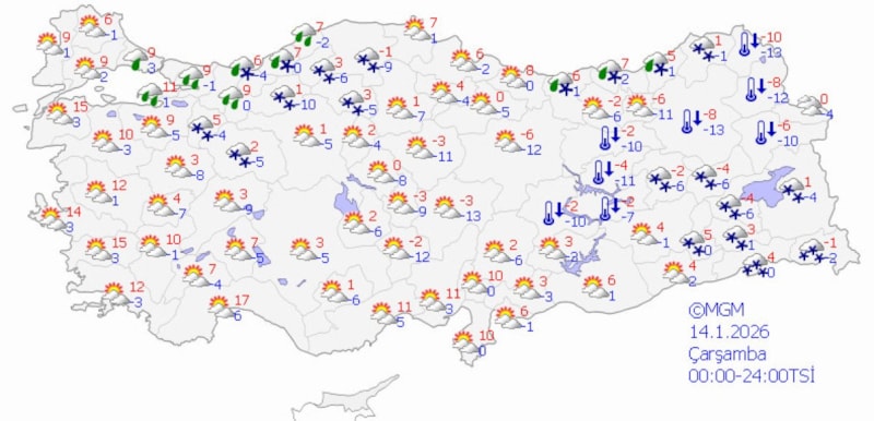 Buna göre; yurt genelinde parçalı ve çok bulutlu, Marmara’nın doğusu, Batı Karadeniz, Doğu Karadeniz kıyıları, Doğu Anadolu'nun güneydoğusu ile Ankara, Eskişehir, Batman, Siirt çevrelerinin yağışlı; kıyıların karla karışık yağmurlu, iç kesimlerin kar yağışlı geçeceği tahmin ediliyor.