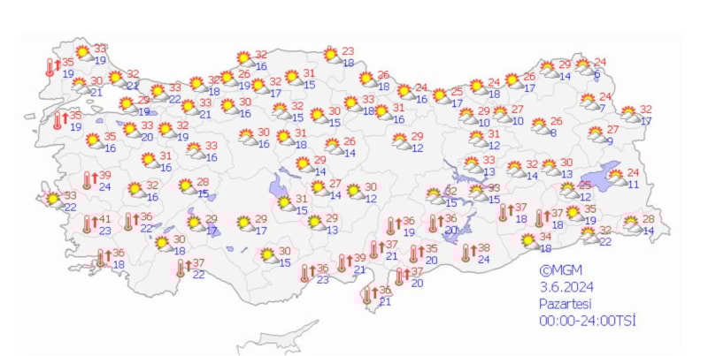 Pazartesi, salı ve çarşamba günleri ülke genelinde hava çok sıcak olacak. Bu bölgelerde sıcaklıklar 35 dereceye kadar yükselecek. Ege ve Akdeniz bölgelerinde ise sıcaklıklar 40 dereceye yaklaşacak.