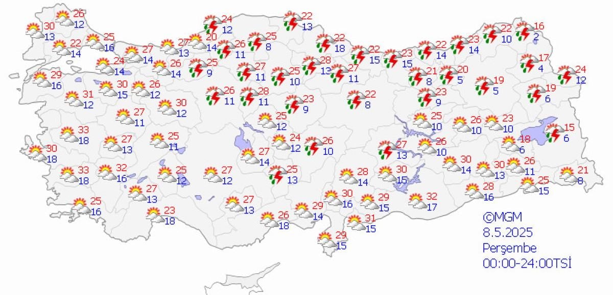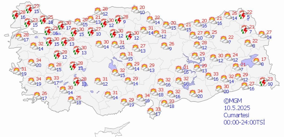 Meteoroloji Genel Müdürlüğü tarafından yapılan tahminlere ; yurdun iç ve doğu kesimlerinin parçalı yer yer çok bulutlu, Doğu Akdeniz'in iç kesimleri, İç Anadolu'nun güneydoğusu, Batı Karadeniz'in iç kesimleri, Doğu Anadolu'nun doğu kesimleri ile Ankara, Çankırı, Kırıkkale ve Kırşehir çevrelerinin yerel olmak üzere sağanak ve gök gürültülü sağanak yağışlı, diğer bölgelerin az bulutlu ve açık geçeceği tahmin ediliyor.