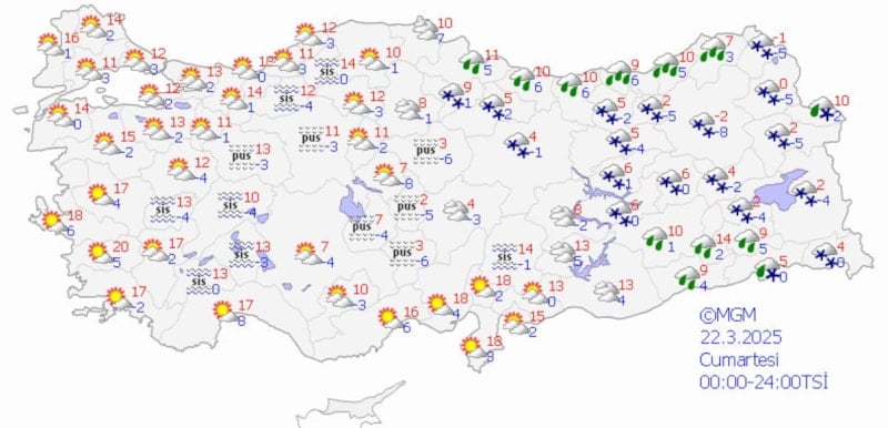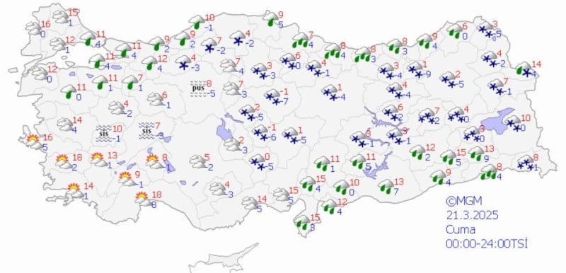 Çok bulutlu, öğle saatlerinden itibaren yağmur ve karışık yağmurlu, iç kesimlerinin yüksekleri kar yağışlı