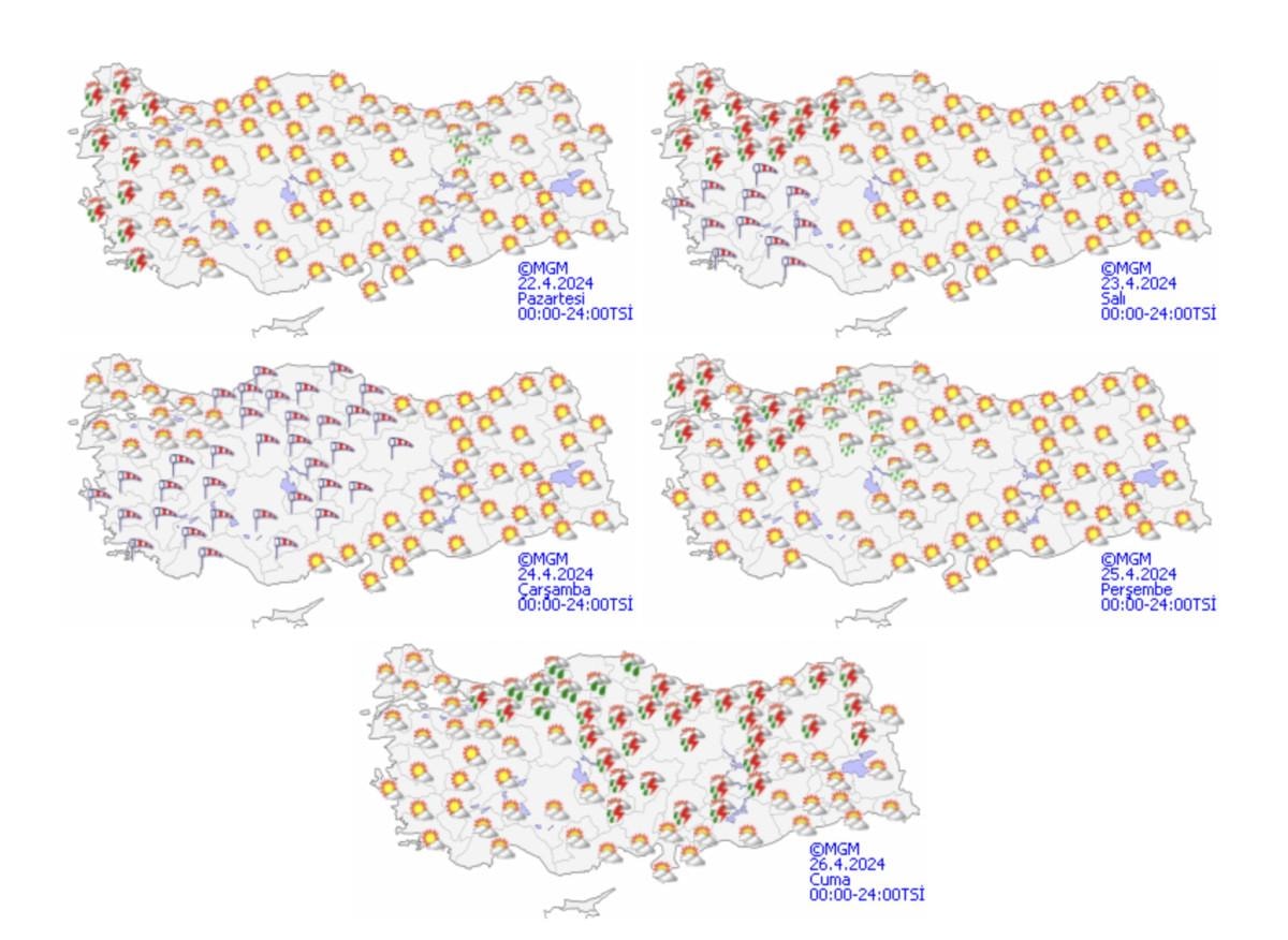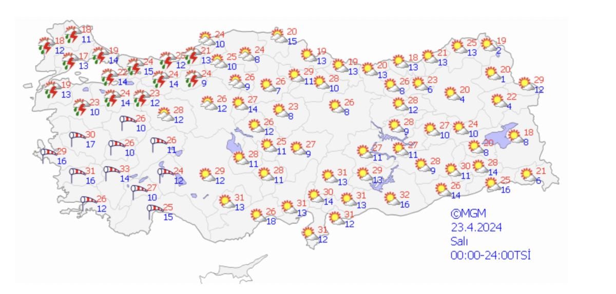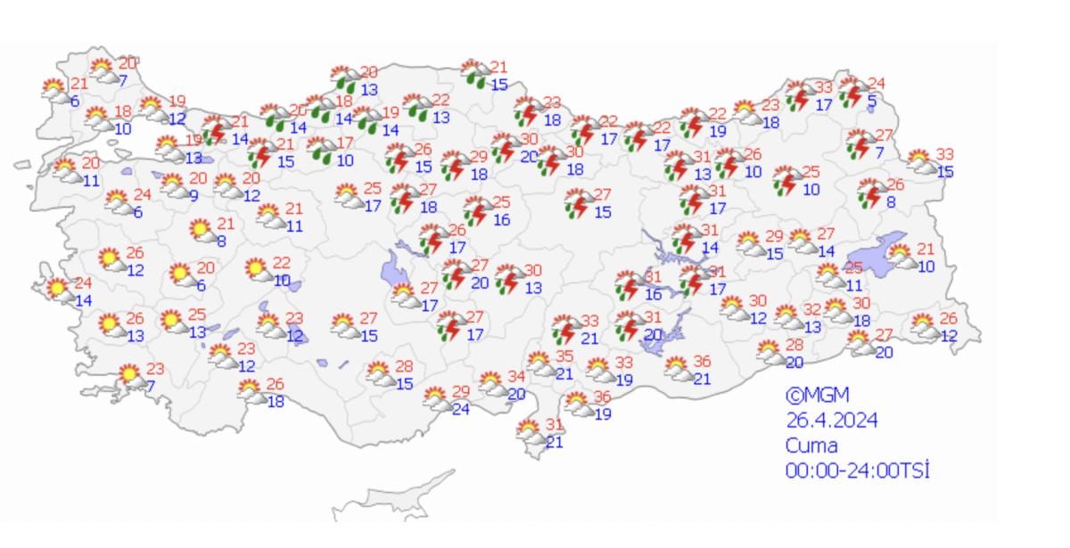 Meteoroloji Genel Müdürlüğü tarafından yapılan son değerlendirmelere göre; Türkiye’nin kuzey ve batı kesimlerinin parçalı yer yer çok bulutlu, Marmara’nın batısı, Kıyı Ege, Ordu, Giresun, Trabzon ve Rize illerinin iç ve yüksek kesimleri, Manisa ve Antalya’nın kuzeybatısı ile gece saatlerinden itibaren Balıkesir, Bursa ve Yalova çevrelerinin yerel olmak üzere sağanak ve yer yer gök gürültülü sağanak yağışlı, diğer yerlerin parçalı ve az bulutlu geçeceği tahmin ediliyor. Marmara'nın batısı, Güney ve Kıyı Ege ile Batı Akdeniz’de toz taşınımı bekleniyor.