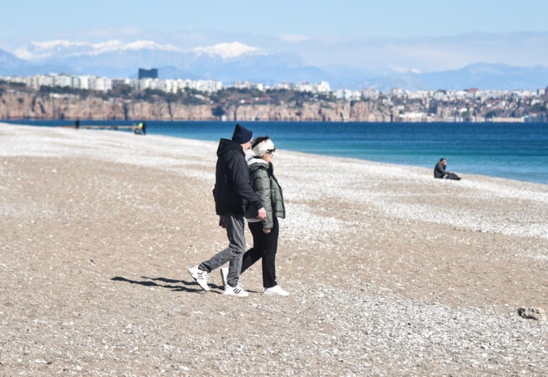 Yurdun büyük bölümünde kar yağışı ve soğuk hava etkili olurken, Antalya'da sahile gidenler güneşli havanın tadını çıkardı.