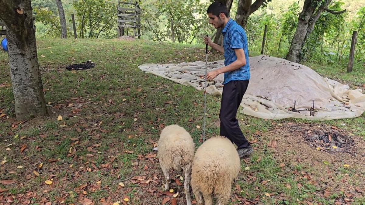 Bir koyun ile mesleğe başlayan Demirci, hayırsever bir vatandaşın hediyesi ile iki koyuna çobanlık yapıyor.