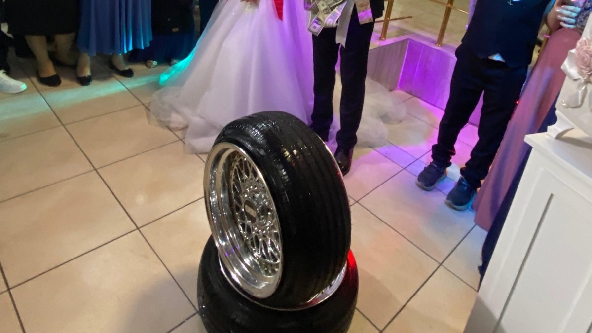 Davetlilerin şaşkın bakışları arasında gelin ve damadın yanına gelen Demirer, jant ve lastiği salonun ortasına bırakarak hediye etti.