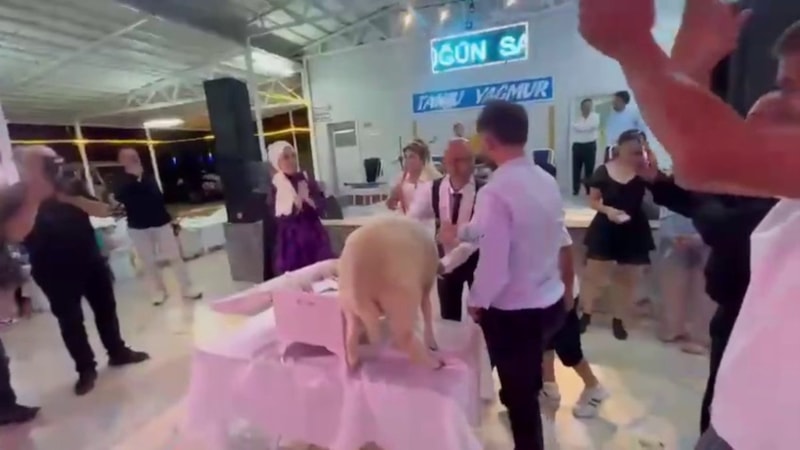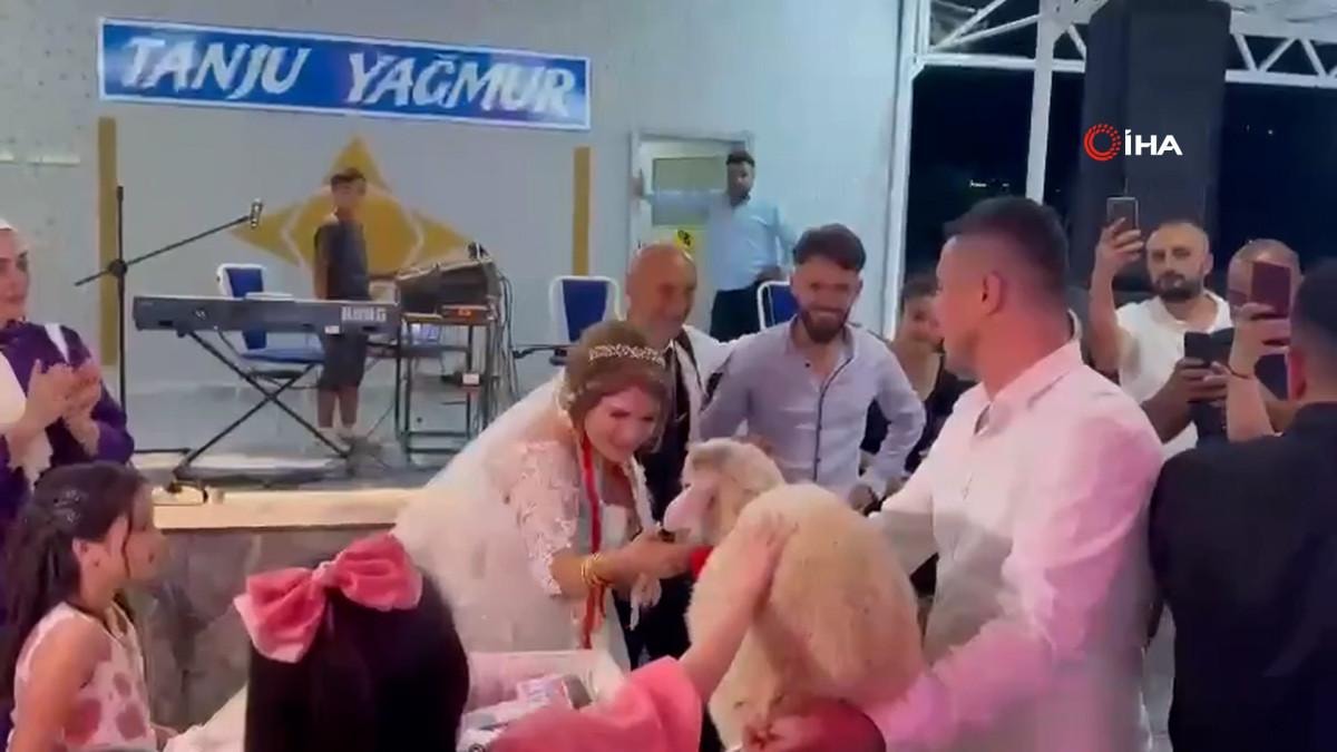 Düğünde damadın arkadaşı, hediye olarak bir koyun getirdi.