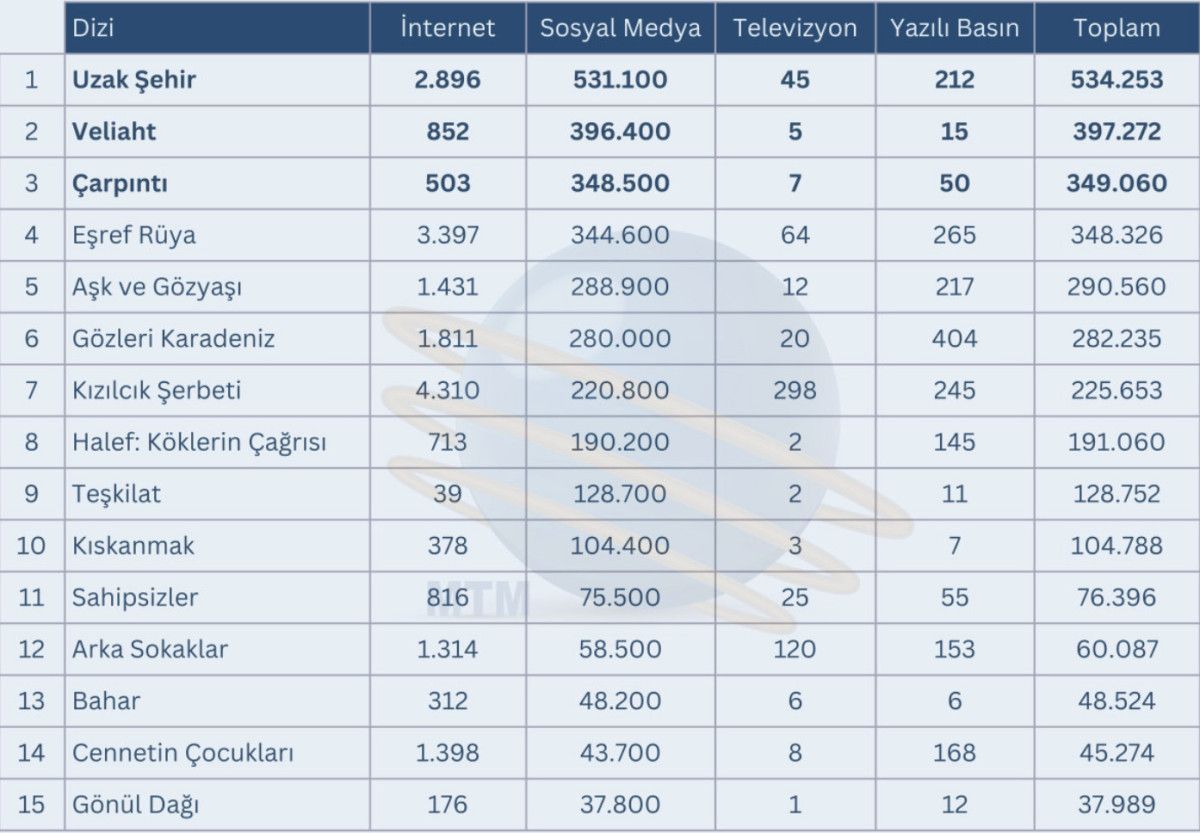 Çıkartılan rapora göre; geleneksel medyada Kızılcık Şerbeti, sosyal medyada ise Uzak Şehir zirvede yer aldı.