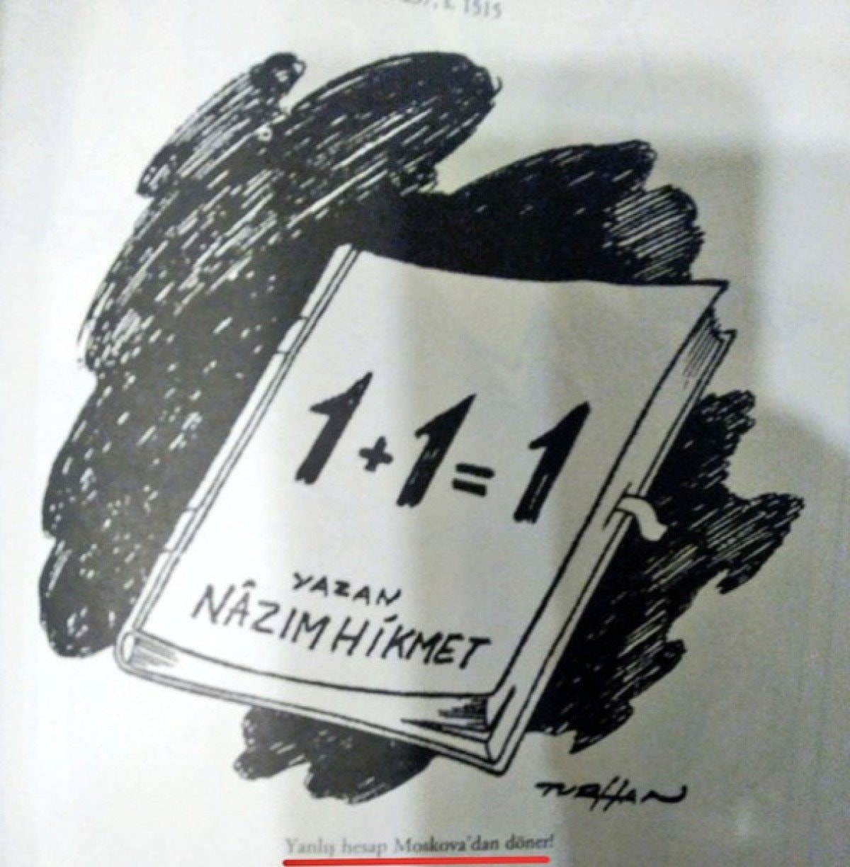 Cumhuriyet’in uzun yıllar başyazarlığını yapan İlhan Selçuk’un ağabeyi karikatürist Turhan Selçuk, Nazım Hikmet’in Rusya’ya kaçışını böyle alaya almıştı (Bayram gazetesi, Temmuz 1951)