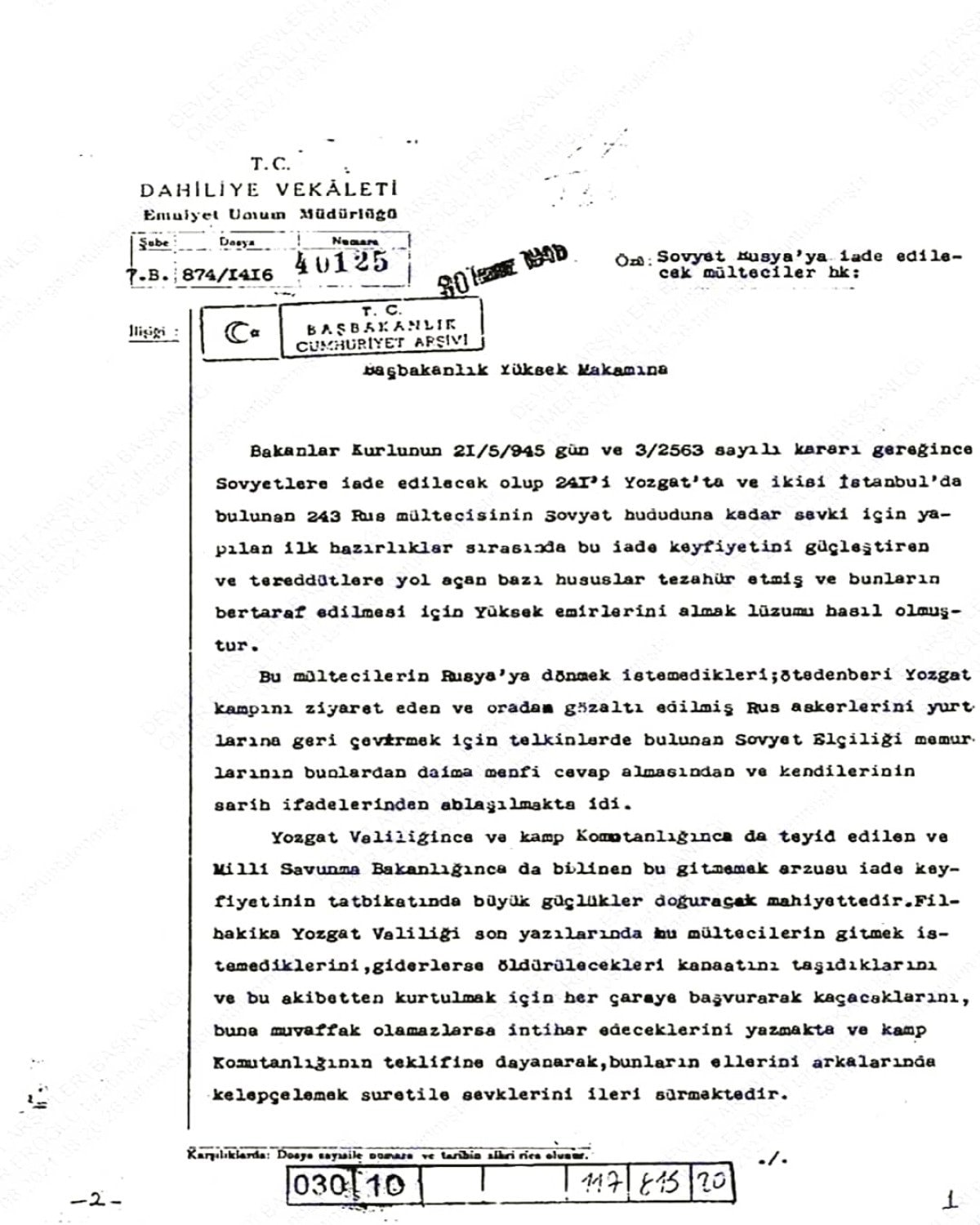 "Bakanlar Kurulu'nun 21 Mayıs 1945 gün ve 3/2563 sayılı kararı gereğince Sovyetlere iade edilecek olup 241’i Yozgat’ta ve ikisi İstanbul’da bulunan 243 Rus mültecisinin Sovyet hududuna kadar sevki için yapılan ilk hazırlıklar arasında bu iade keyfiyetini güçleştiren ve tereddütlere yol açan bazı hususlar tezahür etmiş ve bunların bertaraf edilmesi için yüksek emirlerini almak lüzumu hasıl olmuştur.”