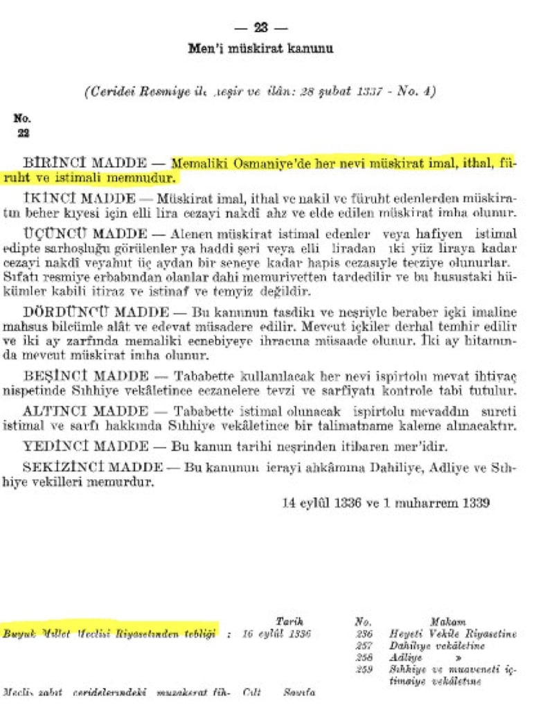 Men’-i Müskirât Kanunu’nun TBMM tutanaklarında yayımlanan metninin Latin harflerine çevrilen hali. Kanunun 1. maddesiyle her türlü alkollü içkinin üretimi, ithali, satışı ve kullanımı tamamen yasaklanmıştı.