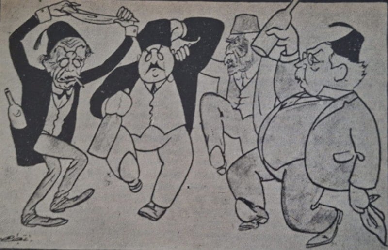 9 Nisan 1924 tarihinde TBMM’nin içki yasağını kaldırması üzerine Zümrüd-i Ankâ adlı mizah dergisinde çıkan karikatürde sevinen içkici gazeteciler böyle resmedilmiş. Soldan sağa: Mahmud Sadık Bey, Cumhuriyet gazetesi sahibi Yunus Nadi, yazar Süleyman Nazif ve yazar Ahmed Rasim.