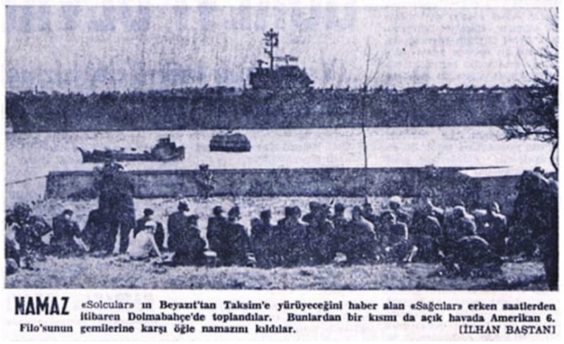 “NAMAZ. “Solcular”ın Beyazıt’tan Taksim’e yürüyeceğini haber alan “Sağcılar” erken saatlerden itibaren sahilde toplandılar. BUNLARDAN BİR KISMI DA AÇIK HAVADA AMERİKAN FİLOSU’NUN GEMİLERİNE KARŞI ÖĞLEN NAMAZLARINI KILDILAR.”