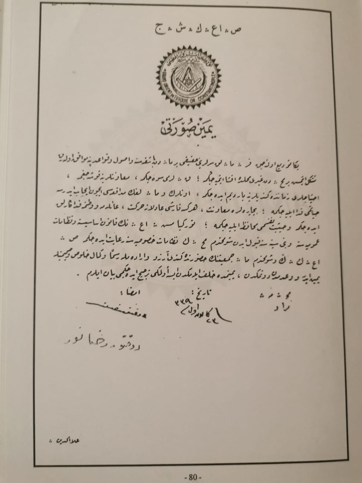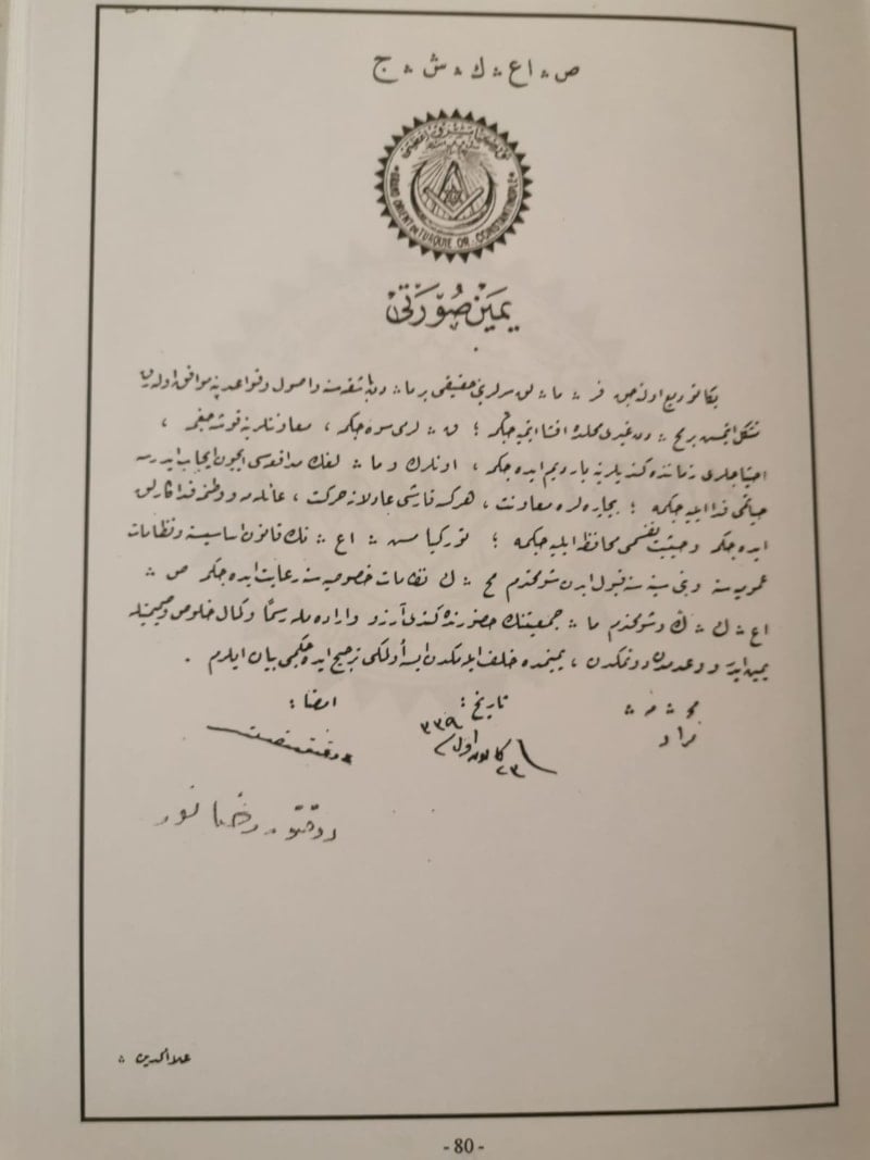 Sayfa 80-81’de ise Rıza Nur’un yemin metni yer almaktadır. Yeminde Masonluk sırlarını gerçek bir Mason'dan başkasına açıklamayacağı, Mason kardeşlerini seveceği, Masonluğun korunması için gerekirse hayatını feda edeceği, sözünü tutmamaktansa ölmeyi yeğleyeceği gibi ilginç ifadeler yer almaktadır. Altında ise 22 Kânunuevvel, yani Aralık 1339 (1923) yazmakta ve “Doktor Rıza Nur” imzası bulunmaktadır.