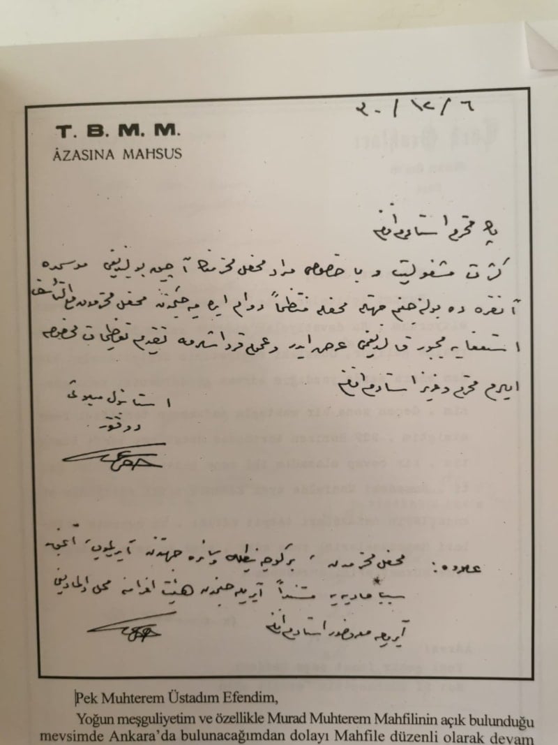 Kesret-i meşguliyet (iş yoğunluğu) ve bahusus Murad mahfil-i muhteremenin açık bulunduğu mevsimde Ankara’da bulunacağım cihetle mahfile muntazaman devam edemeyeceğimden mahfil-i muhteremden maatteessüf istifaya mecbur kaldığımı arz eder ve umum kardeşlerime takdim-i ta’zimat-ı mahsus eylerim (özel saygılarımı sunarım) muhterem ve aziz Üstadım efendim.