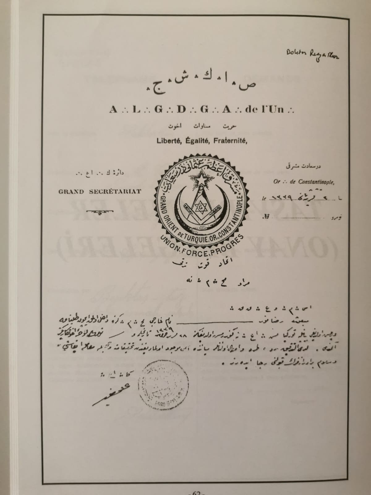 Milletvekili Rıza Nur adlı harici (Mason olmayanlara böyle derler-MA) Sayın Locanıza dahil olmak için İstek Belgesi vermiş olduğu beyanıyla Türkiye Büyük Doğusu’na göndermiş olduğunuz 2 Kasım 1339 tarih ve 2 numaralı levhanız alındı.