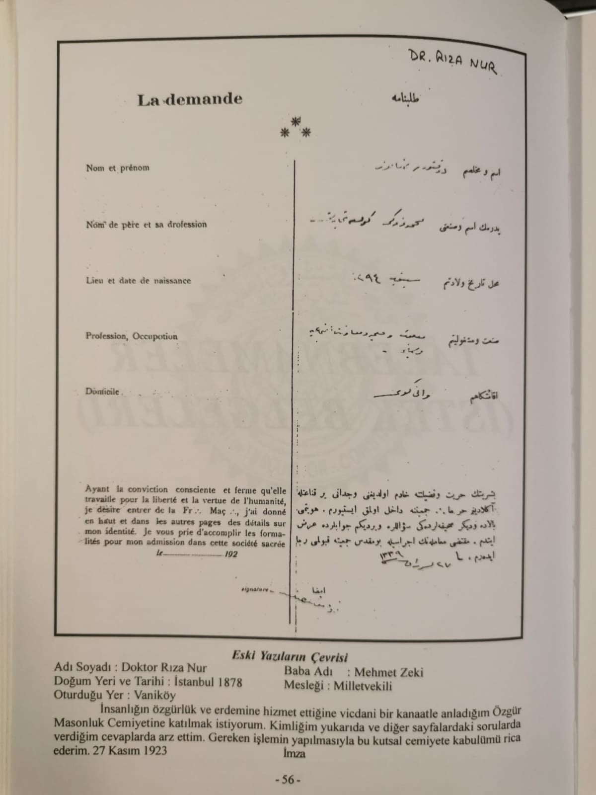 Kitabın 56. sayfasında yer alan Rıza Nur’un Osmanlıca Mason olma talepnamesinin fotokopi ve çevirisi şöyledir (çevirideki hataları düzelttim):