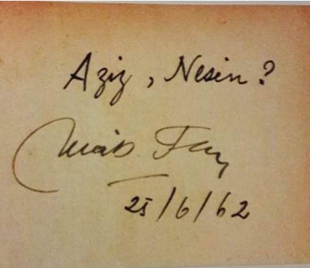 Necip Fazıl ile Aziz Nesin birbirlerine takılıyor ve birazdan okuyacağımız gibi mektup da yazıyorlardı. Aziz Nesin Vakfı’nda Necip Fazıl’ın bir kitabını imzalarken Zübük yazarına şöyle hitap ettiğini öğrenmiştik: