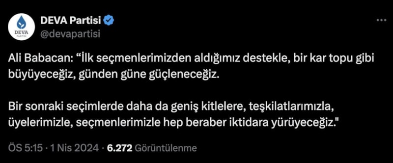 Babacan, açıklamasında DEVA Partisi'nin ilk kez kendi başına seçime girdiğine dikkat çekerken iktidar vurgusu yaptı.
