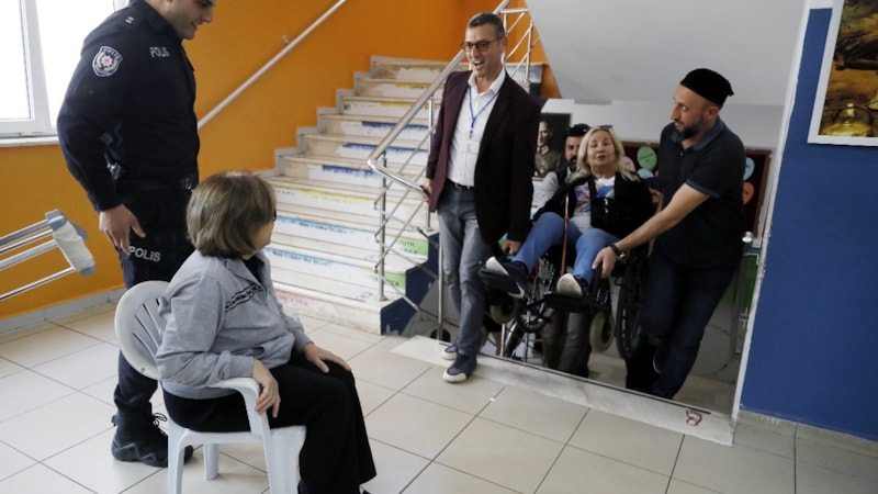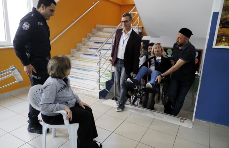 Bacağından ameliyat olan Suzan Ük (64), getirilen plastik sandalyeye alınarak 3 görevlinin yardımı ile 3'üncü kata çıkartılıp, oyunu kullandı. Yine görevlilerin yardımıyla okul bahçesine indirilen Suzan Ük, seyyar sandık ya da giriş katta oy kullanmak için tanınan başvuru sürecine yetişemediğini söyledi. Ük, "Sağ olsunlar, yardımcı oldular. Asansör arızalıymış. Şaşırdım, böyle oy kullanmayı beklemiyordum" dedi.
