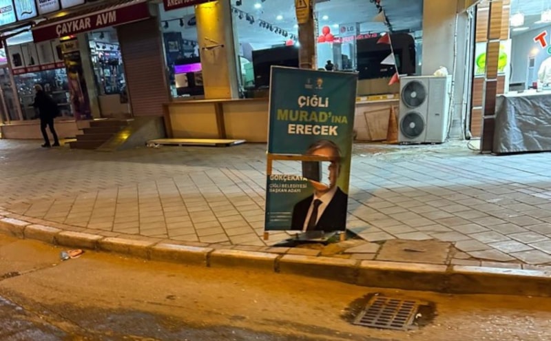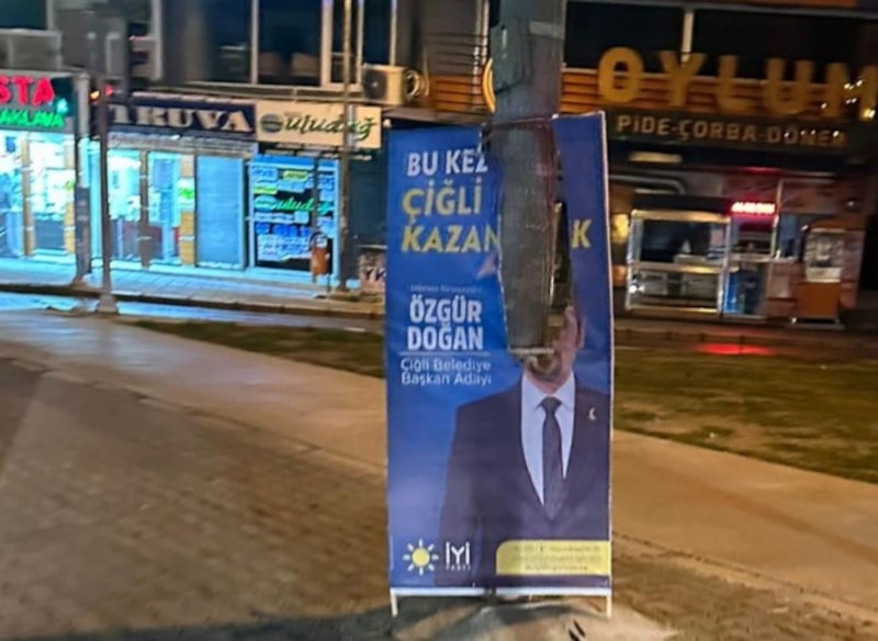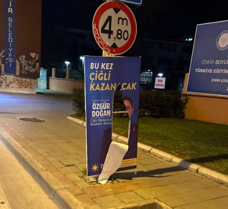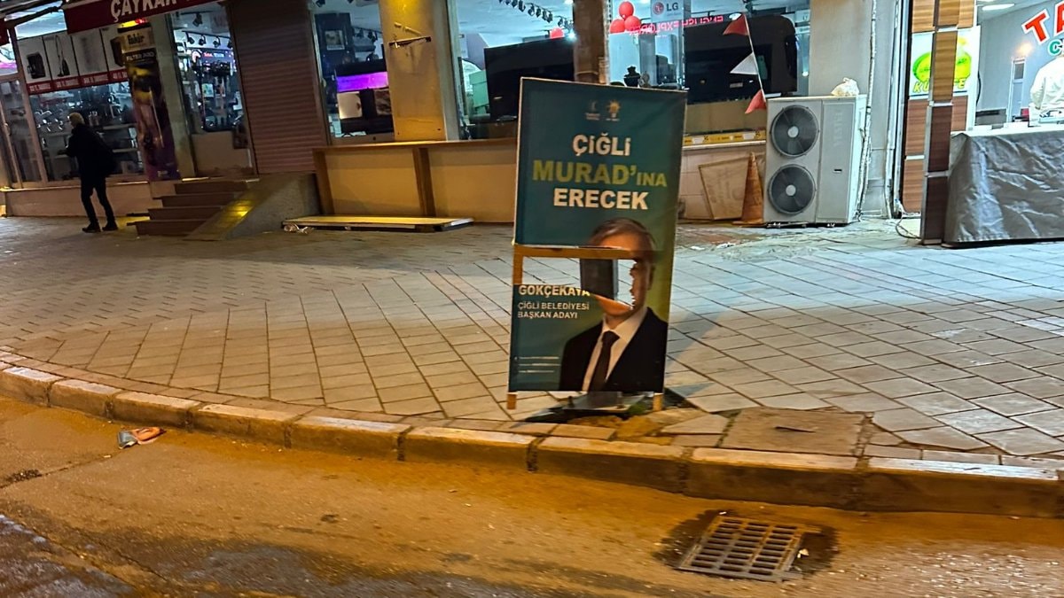 İzmir'in Çiğli ilçesinde AK Parti ve İyi Parti'nin başkan adaylarının yer aldığı afişler yırtıldı. Saldırgan, kamera kayıtlarından tespit edilerek yakalandı.
