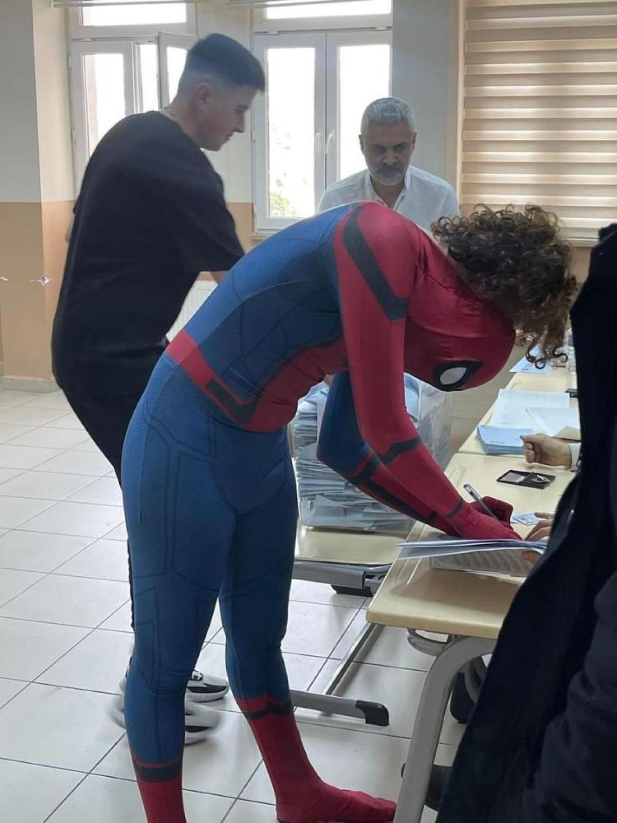 Spiderman kıyafeti giyen Demir, vatandaşların ve özellikle çocukların ilgisini çekti. Renkli görüntülere sahne olan oy kullanma anı cep telefonu kamerasıyla görüntülendi.