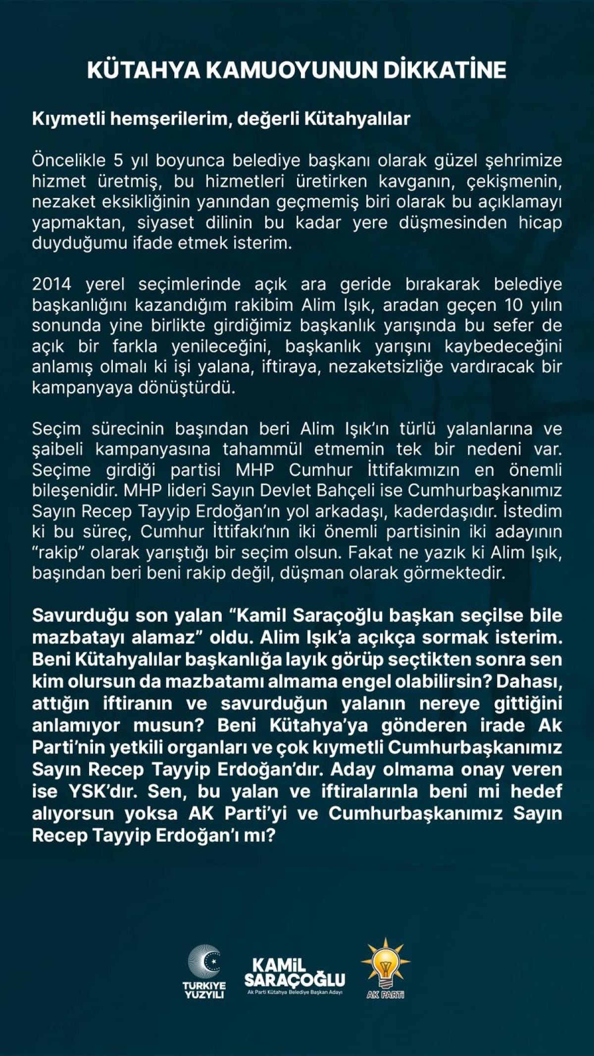Savurduğu son yalan 'Kamil Saraçoğlu başkan seçilse bile mazbatayı alamaz'oldu. Alim Işık'a açıkça sormak isterim. Beni Kütahyalılar başkanlığa layık görüp seçtikten sonra sen kim olursun da mazbatamı almama engel olabilirsin? Dahası, attığın iftiranın ve savurduğun yalanın nereye gittiğini anlamıyor musun?