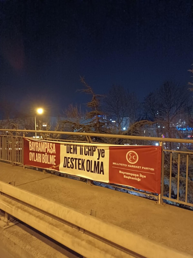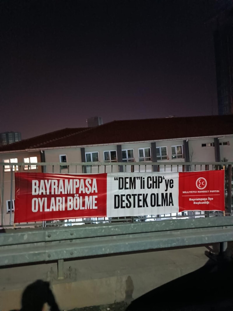Cumhur İttifakı'na kaybettirmek üzere Bayrampaşa'da yapılan CHP-DEM Parti iş birliğine karşı MHP İlçe teşkilatı, "Bayrampaşa'da oyları bölme, DEM'li CHP'ye destek olma" afişleri astı.