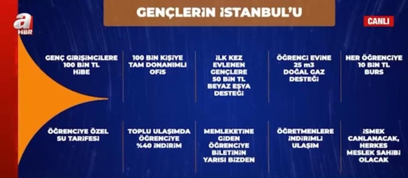 Öğrenciye özel su tarifesi, ilk kez evlenen gençlere 50 bin lira beyaz eşya desteği, her öğrenciye yıllık 10 bin lira burs vereceğiz. Öğrenci evlerine aylık 25 metreküp doğalgaz desteği vererek yanlarında olacağız. Toplu ulaşımda yüzde 40 indirim yapacağız ve memleketine giden öğrencilerin bilet parasının yarısını yılda iki kez biz ödeyeceğiz.