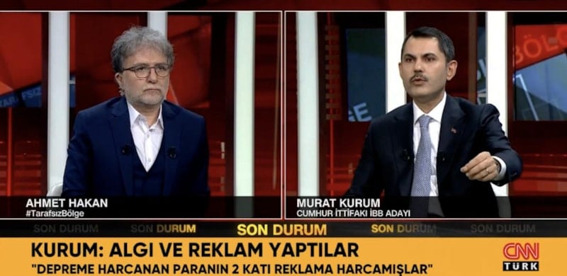 Cumhur İttifakı'nın İstanbul Büyükşehir Belediyesi başkan adayı Murat Kurum, CNN Türk'te moderatörlüğünü Ahmet Hakan'ın yaptığı Tarafsız Bölge programına konuk oldu.