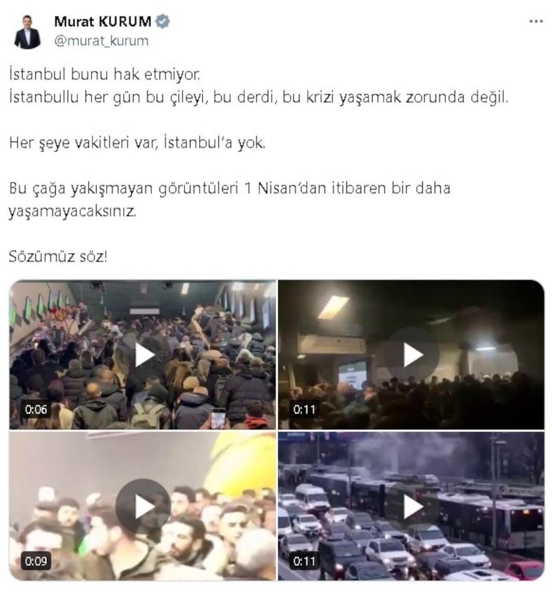 Cumhur İttifakı'nın İBB adayı Murat Kurum, İstanbulluların her gün yaşadığı ulaşım sorununu özetleyen 4 videoyu paylaşarak, "Bu çağa yakışmayan görüntüleri 1 Nisan’dan itibaren bir daha yaşamayacaksınız" ifadelerini kullandı.