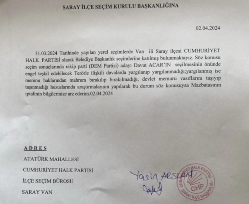 Arslan'ın imzasıyla başkanlığa sunulan dilekçede, "31 Mart tarihinde yapılan yerel seçimlerde Van ili Saray ilçesinde Cumhuriyet Halk Partisi olarak belediye başkanlık seçimlerine katılmış bulunmaktayız. Söz konusu seçim sonuçlarında rakip parti (DEM Parti) adayı Davut Acar'ın seçilmesi önünde engel teşkil edebilecek terörle ilişkili davalarda yargılanıp yargılanmadığı, yargılanmış ise memnu haklarından mahrum bırakılıp bırakılmadığı, devlet memuru vasıflarını taşıyıp taşımadığı hususlarında araştırmaların yapılarak, bu durum söz konusu ise mazbatasının iptalini bilgilerinize arz ederim." ifadelerine yer verilmişti.