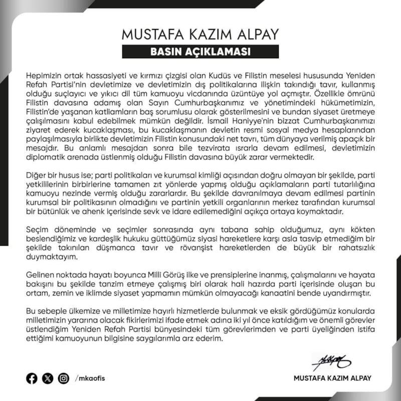 Bu sebeplerle ülkemize ve milletimize hayırlı hizmetlerde bulunmak ve eksik gördüğümüz konularda milletimizin yararına olacak fikirlerimizi ifade etmek adına iki yıl önce katıldığım ve önemli görevler üstlendiğim Yeniden Refah Partisi bünyesindeki tüm görevlerimden ve parti görevlerimden istifa ettiğimi kamuoyunun bilgisine saygılarımla arz ederim.