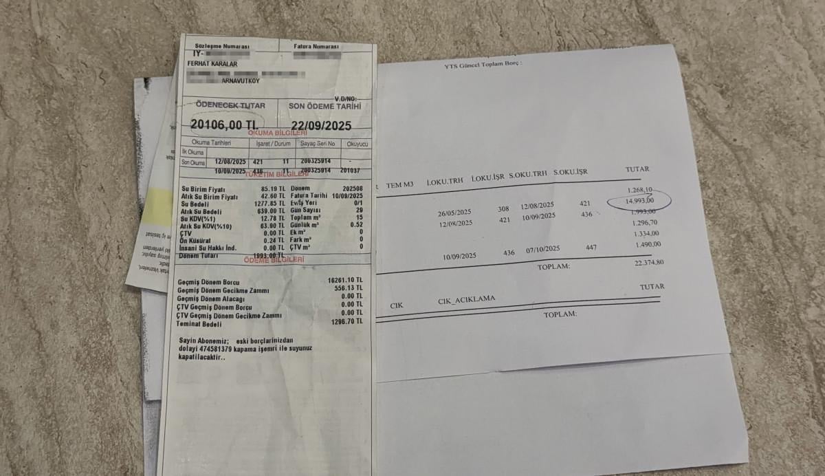 İstanbul'un Arnavutköy ilçesinde 50 metrekarelik bir butik kafeyi işleten Merve Karalar, Temmuz ayında açtığı işletmesine 15 ila 20 bin TL arasında değişen su faturası gönderildiğini belirtti. Faturanın 5. ve 6. aylara ait olduğu iddia edilirken, işletme sahibi faturanın kafesinin faaliyete başlamasından önceki döneme denk geldiğini söyledi.