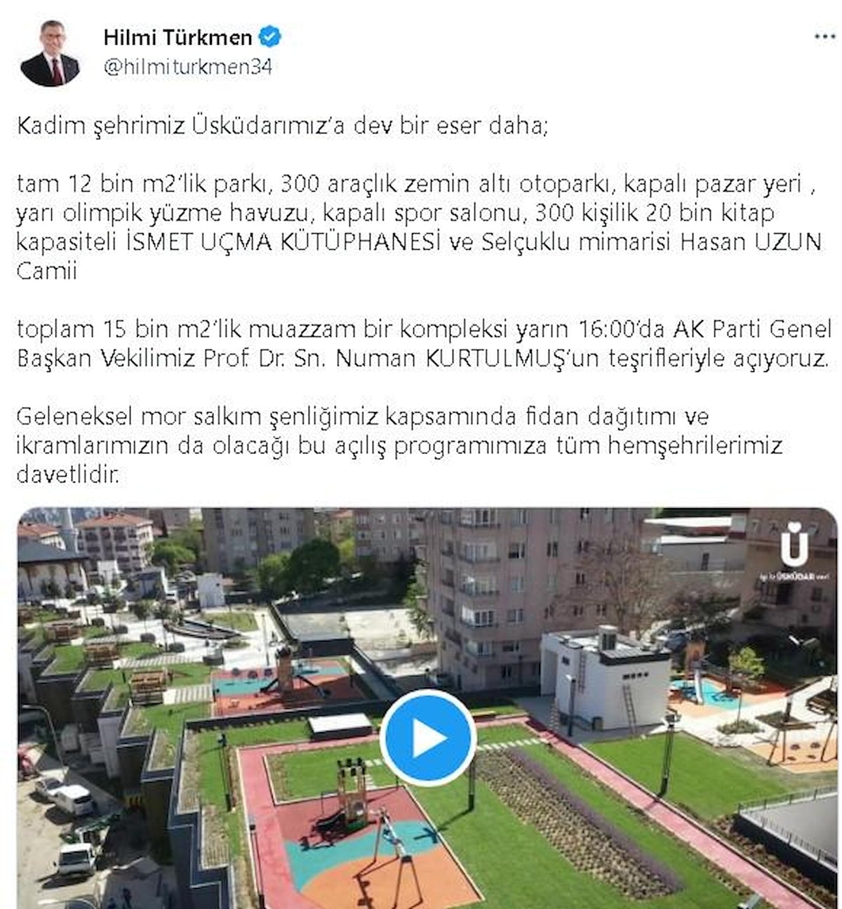 Geleneksel mor salkım şenliği kapsamında açılışı yapılacak olan İsmet Uçma Kütüphanesi ve Hasan Uzun Camii kompleksiyle ilgili bilgi veren Üsküdar Belediye Başkanı Hilmi Türkmen, sosyal medya hesabından paylaştığı video ile şu ifadelere yer verdi:
