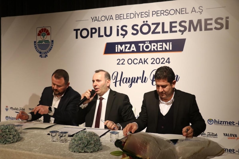 Konuşmaların ardından Başkan Tutuk, Hizmet-İş sendikası Bursa Şube Başkanı Mustafa Yavuz ve Yalova Belediyesi Personel AŞ Yönetim Kurulu Başkan Vekili Alpan Solmaz arasında imzalandı.